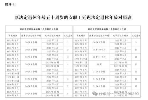 3.原法定退休年齡五十周歲的女職工延遲法定退休年齡對照表